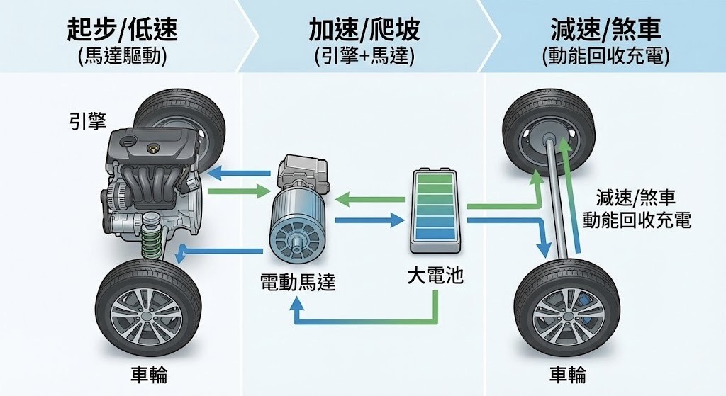 • 起步/低速時:用電動馬達推動(省油、安靜)。